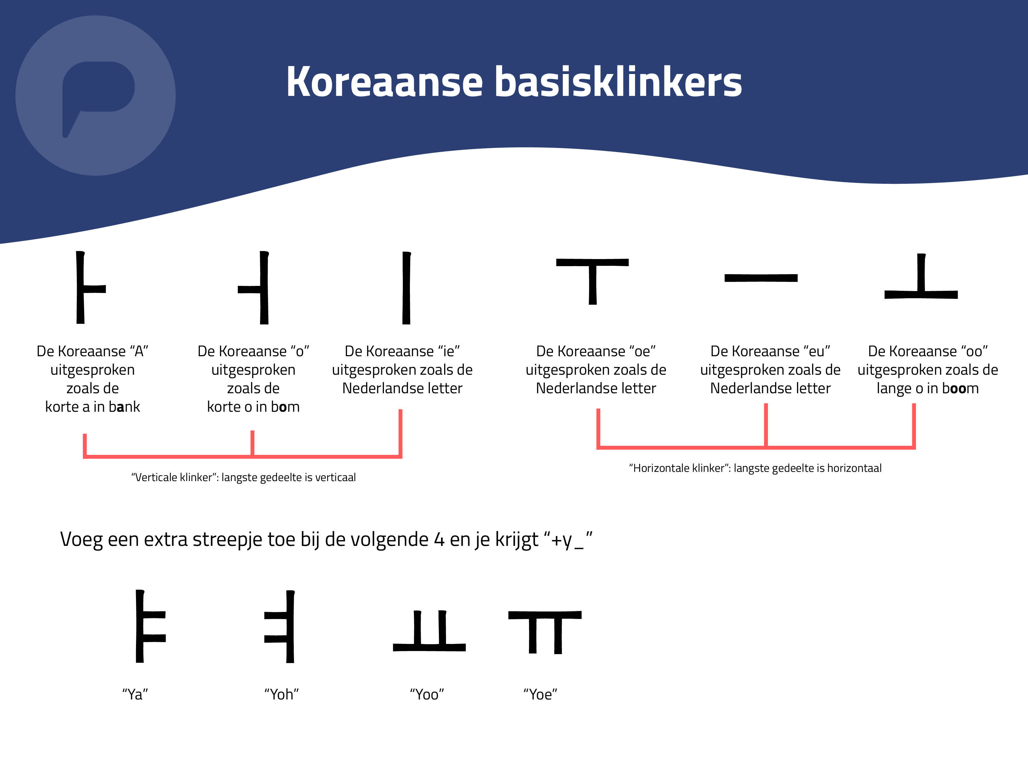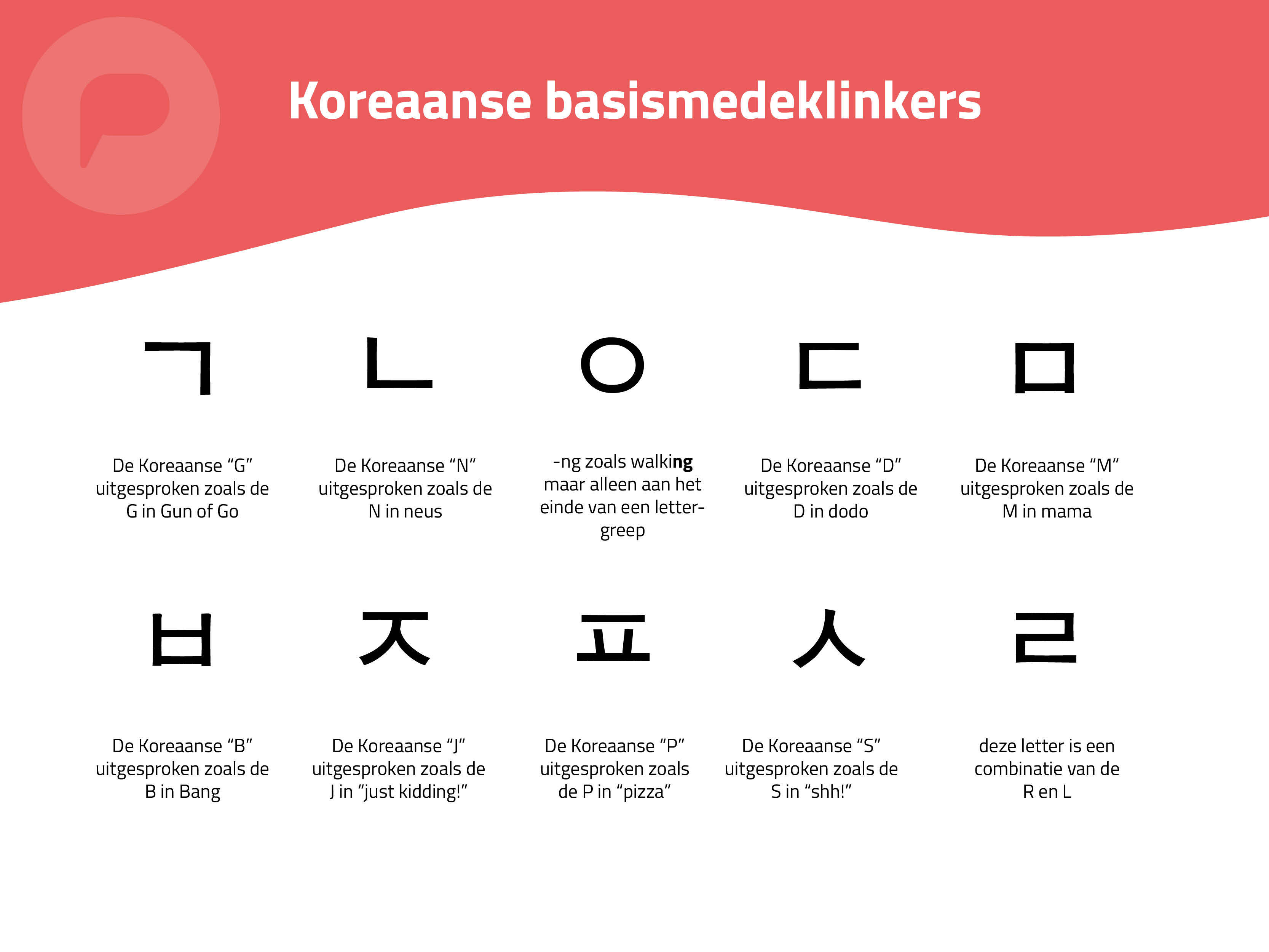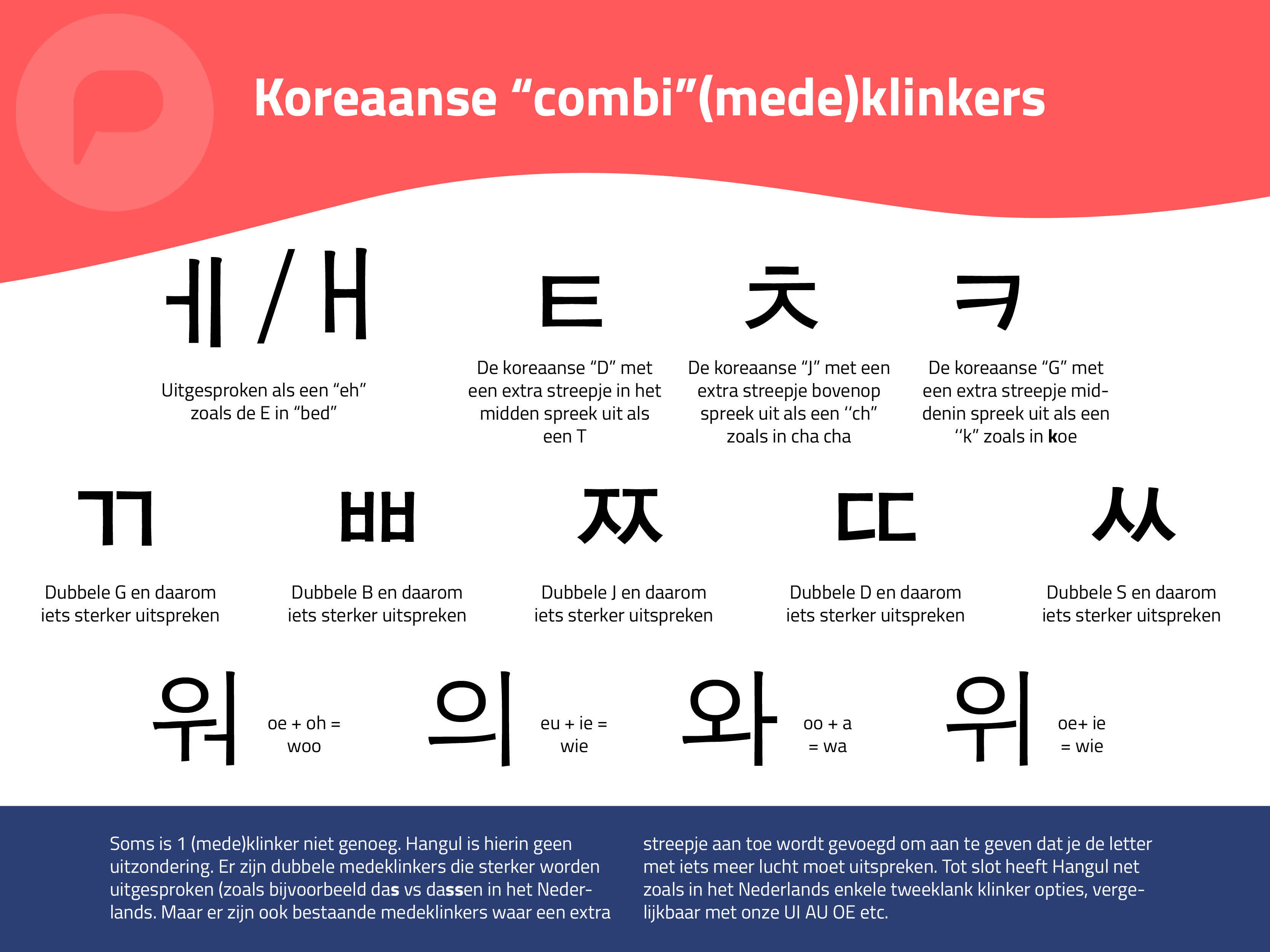 Hangul bestaat uit tien “basismedeklinkers” (afbeelding 1) en 6 “basisklinkers” (afbeelding 2). Wij noemen deze letters basis(mede)klinkers omdat er voor een aantal andere varianten bestaan die de uitspraak lichtelijk veranderen. Zo kan je een extra streepje toevoegen aan 4 van de 6 klinkers om een +y voor de klinkerklank toe te voegen. Maar ook extra streepjes aan medeklinkers om aan te geven dat je de medeklinker met iets meer lucht moet uitspreken. Tot slot zijn er dubbele medeklinkers die je ook sterker uit moet spreken en een handvol aan tweeklank klinkers. (Afbeelding 3), waarmee het totaal uitkomt op 25 letters, vergelijkbaar met ons eigen alfabet.